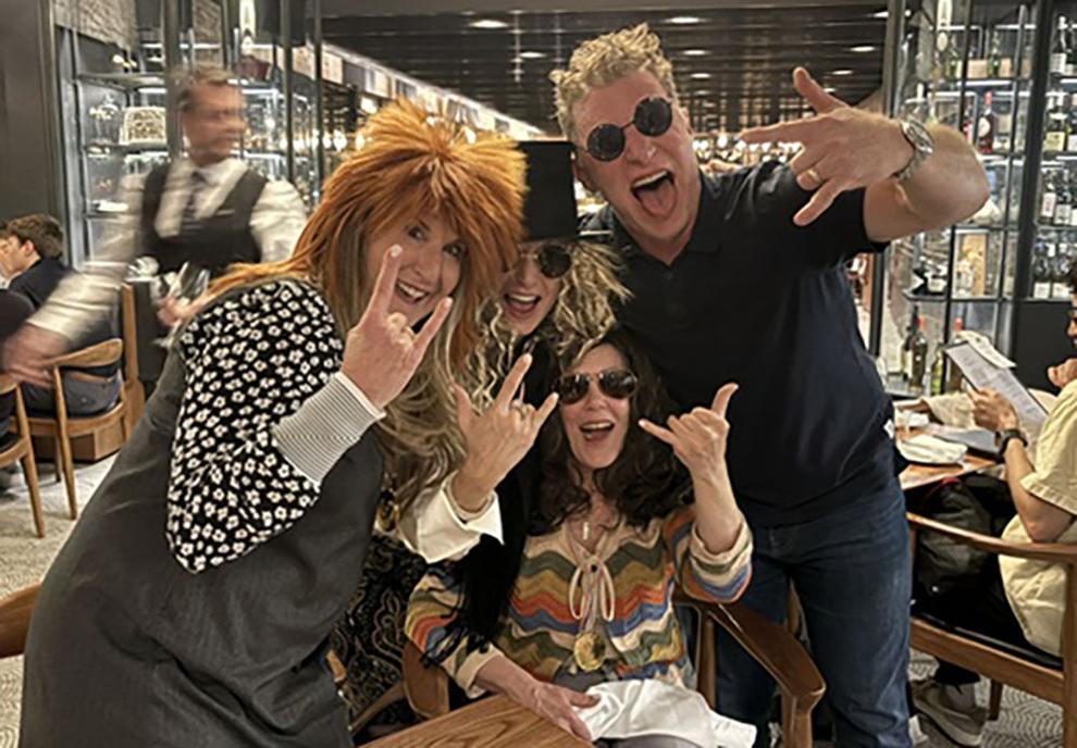We are dressed in fun, get out of your dark heavy winter clothes, spring wear. I, of course, have groovy printed pants on! Lucy noticed. Secretly, I’m carrying a bag into the restaurant which has 80’s styled wigs and sunglasses. Both Ellen and Lucy know what’s going to happen and what I need for my fundraising campaign. This is not their first rodeo with me.
